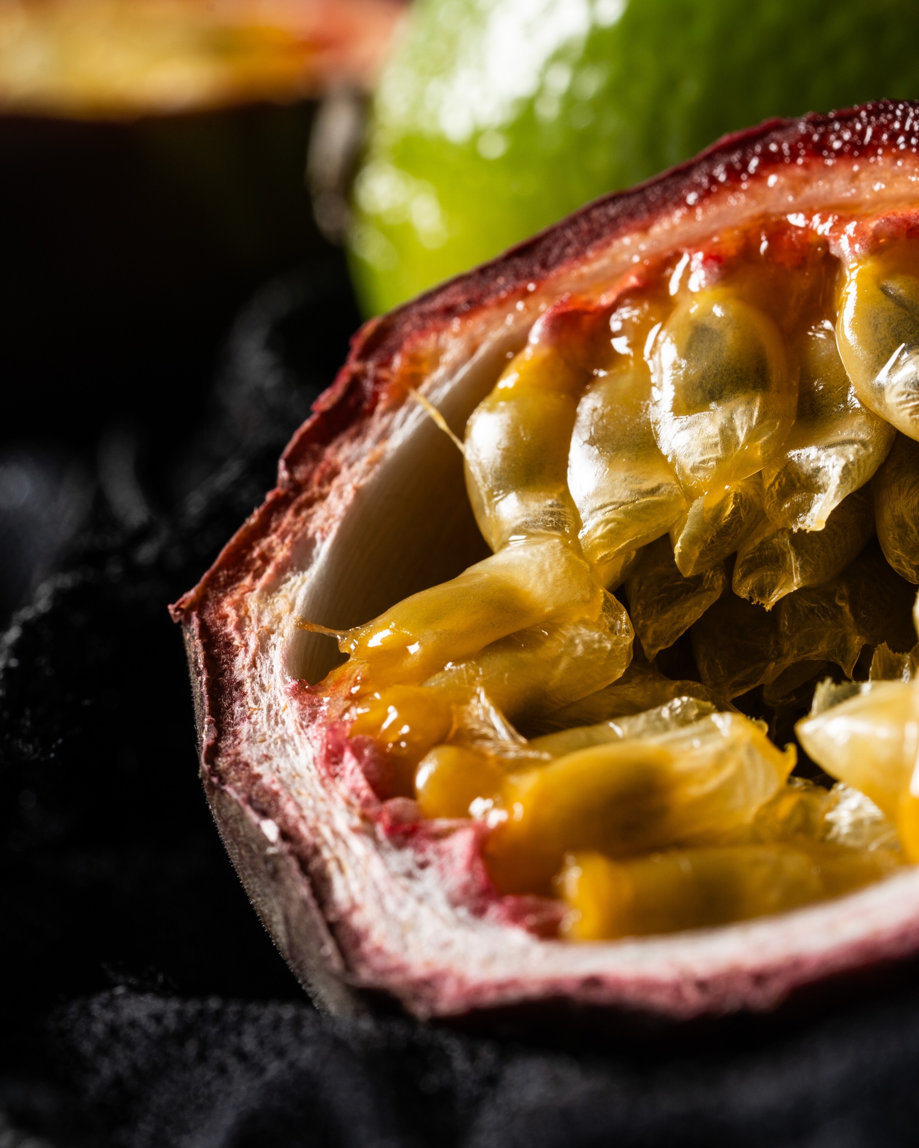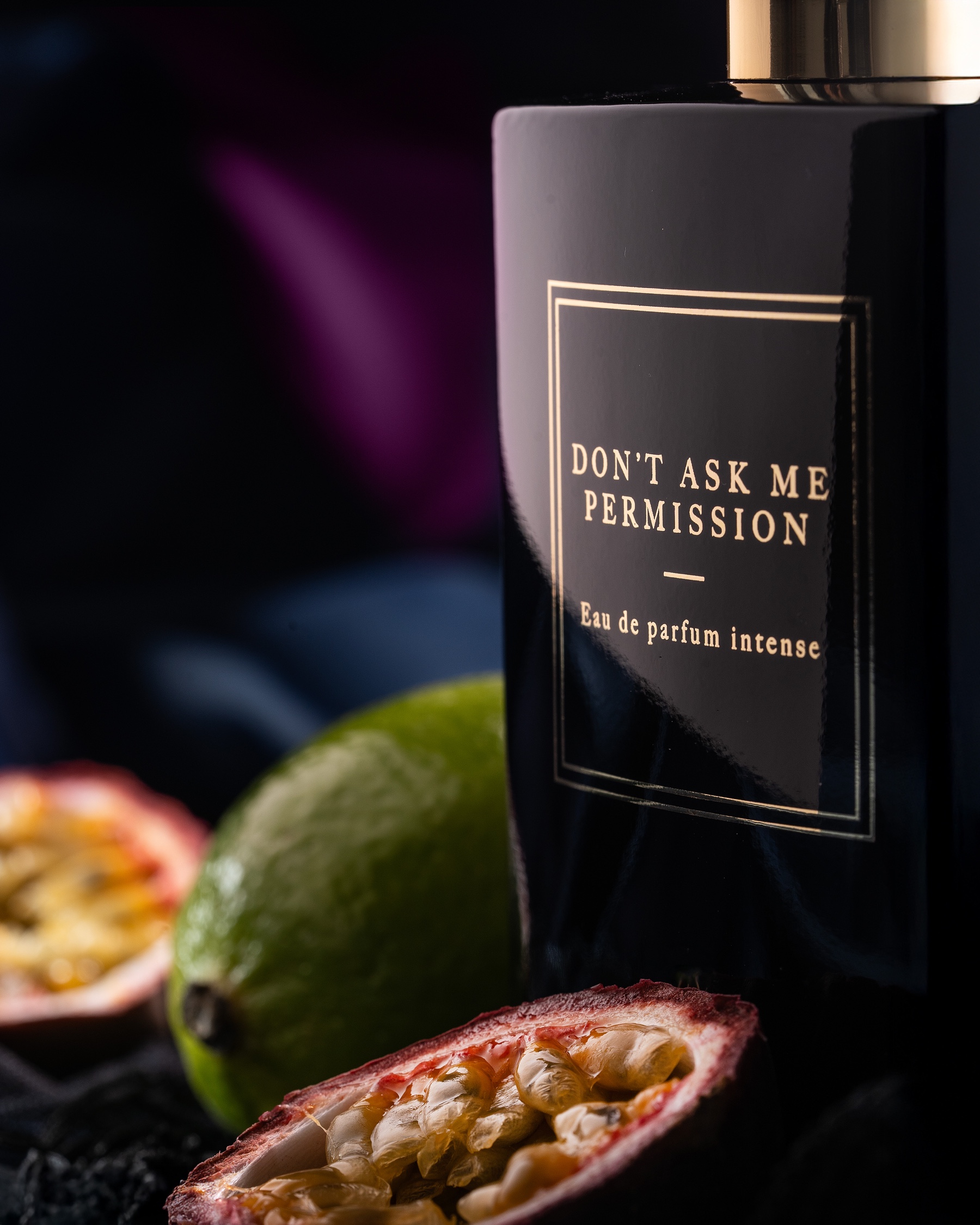 Il flacone nero, elegante e deciso, è immerso in un gioco di luci viola e porpora, che richiama la notte, la passione e il mistero. Il fumo sullo sfondo amplifica l’effetto ipnotico e sensoriale, mentre elementi come il passion fruit tagliato, il cocktail ghiacciato con lime e il tessuto in pizzo nero suggeriscono piacere, seduzione e femminilità sfacciata.